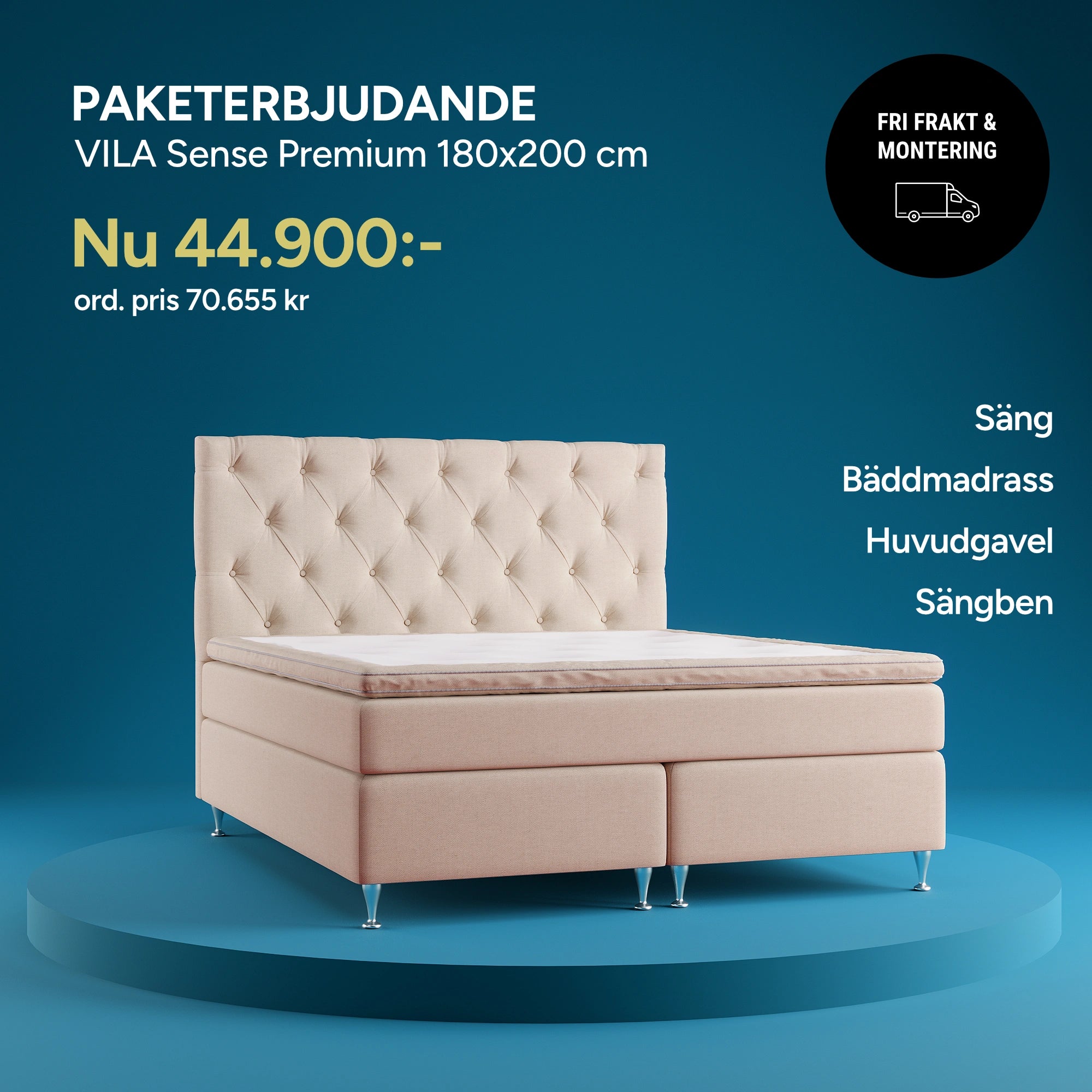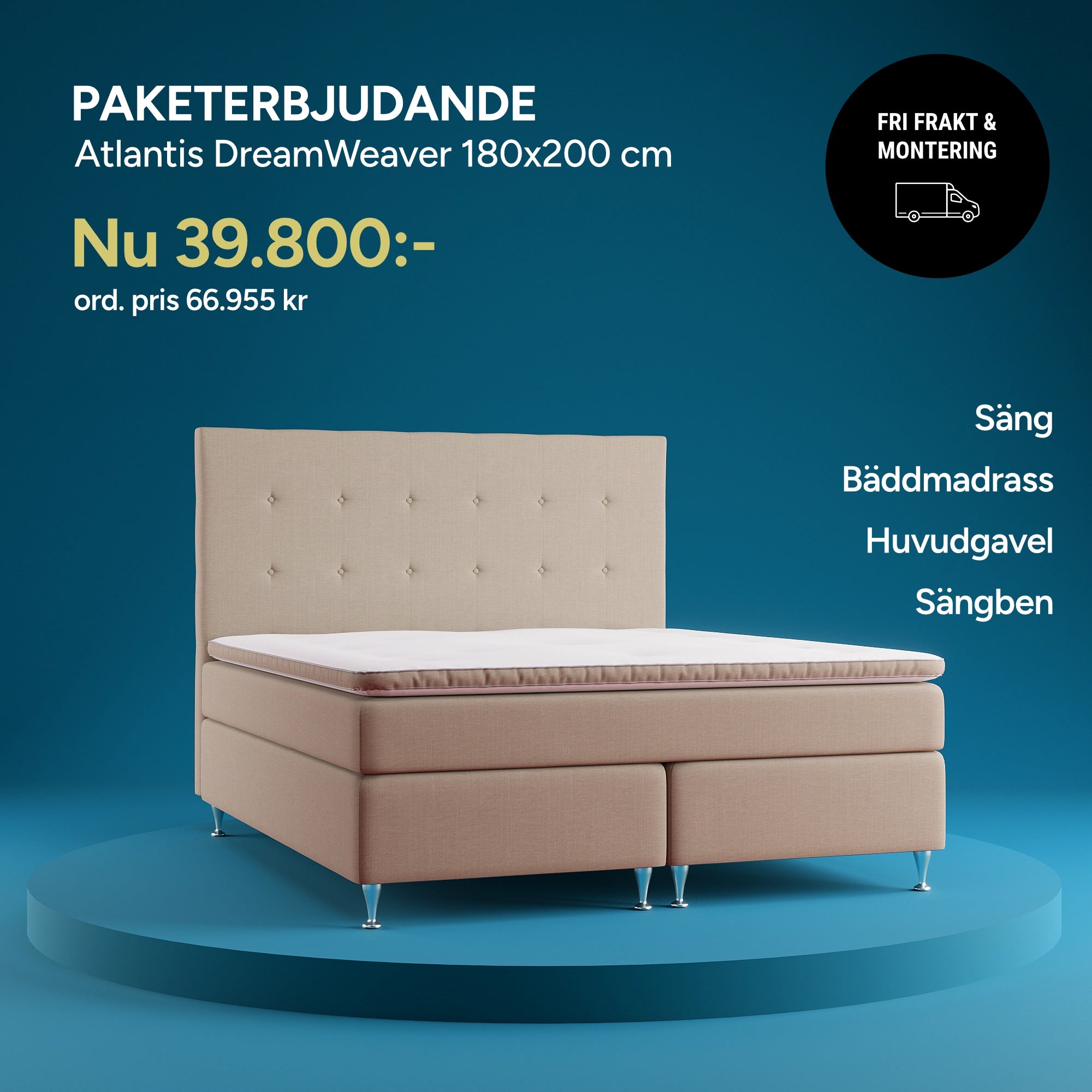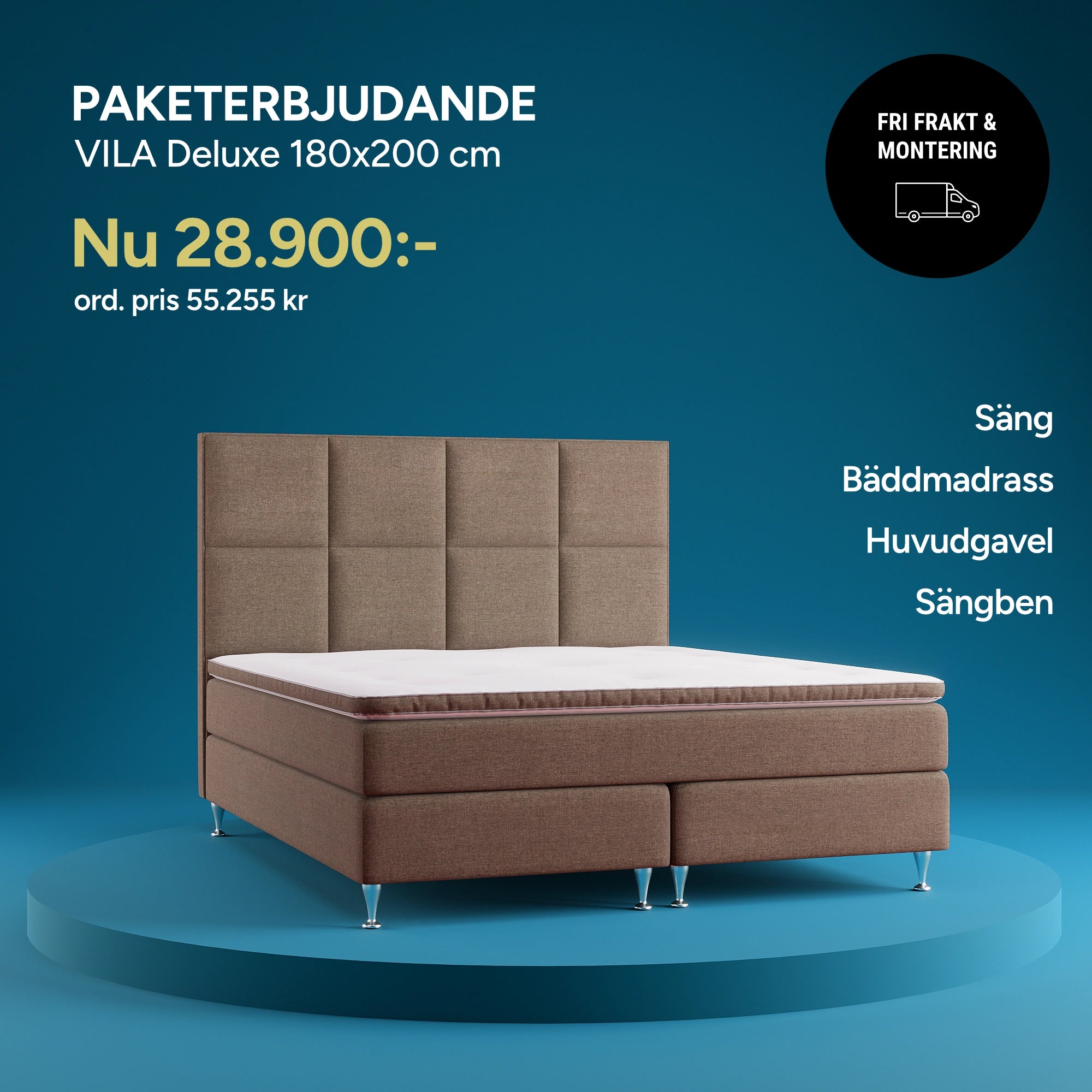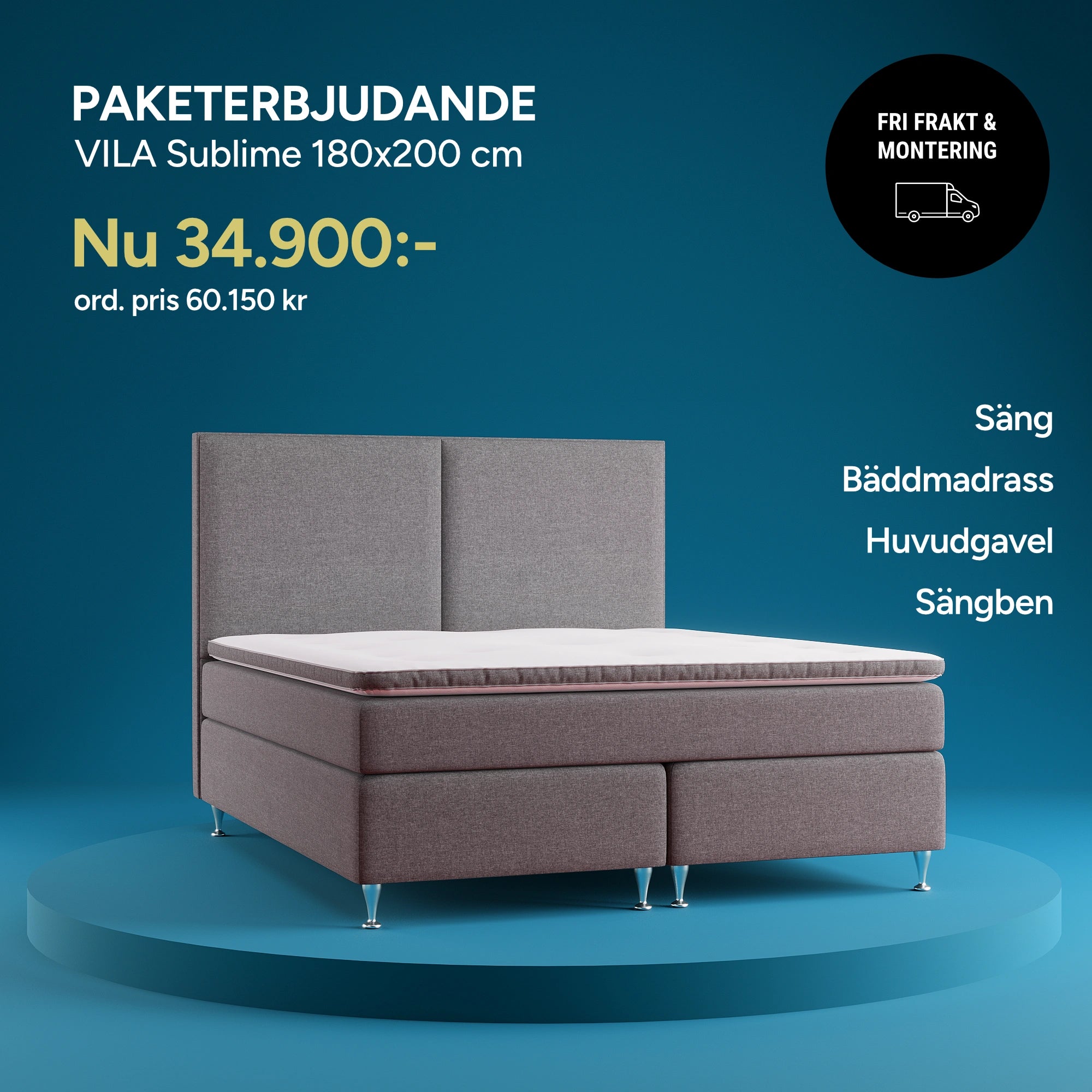 Ta del av våra kampanjpriser på utvalda sängpaket. Bäddmadrass ingår och du väljer fritt bland huvudgavlar och sängben som ingår i paketet. Fler erbjudanden hittar du i våra butiker. *Fri frakt & montering inom 3 mil.