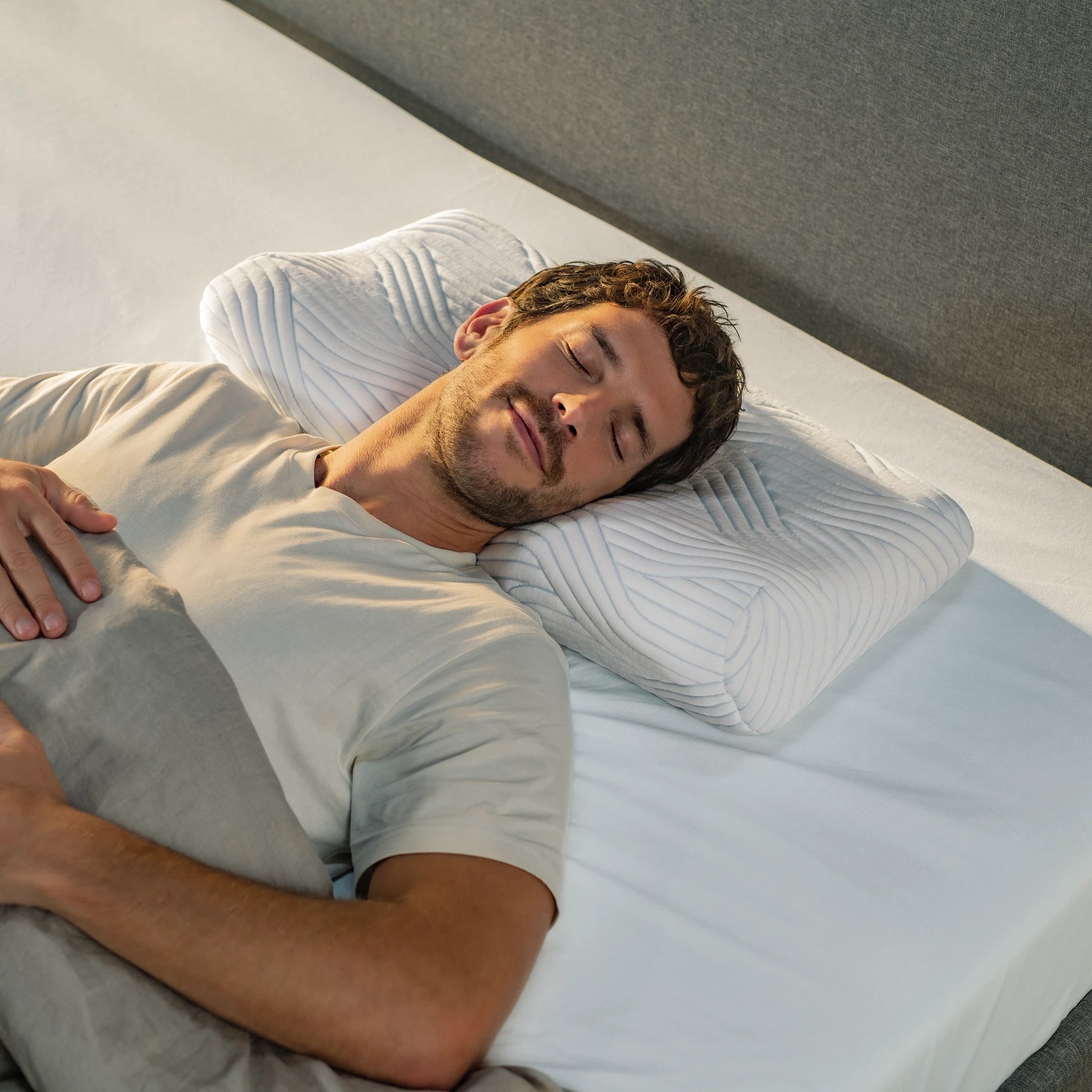 Tempur ErgoPlus har en böjd framåtlutande form med en centrerad fördjupning, så att axeln finner ett litet utrymme underifrån. Detta gör axelkontakten med kudden tätare och stabiliserar nack- och halsområdet med tryckavlastande riktande stöd och komfort. Det innovativa fodralet med SmartCool™ Technology är svalt att ta på och absorberar överskottsvärme för att hålla dig sval och fräsch, från det ögonblick du lägger dig ner.